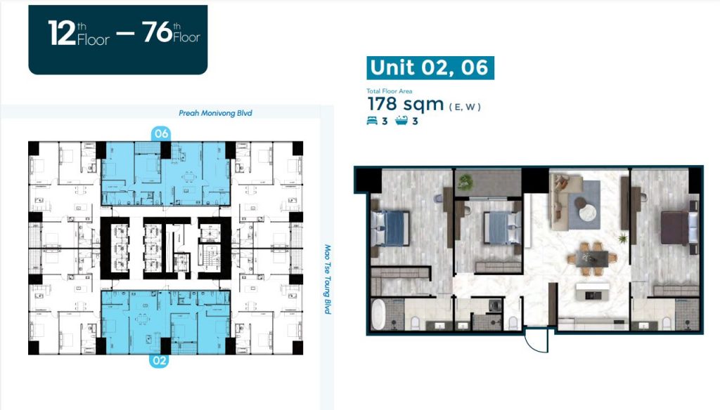 3 Bedroom selling at $330,000 (178 sq.m units on the 12th floor – $1,853/sqm) with a tentative completion date of Q4 2028.