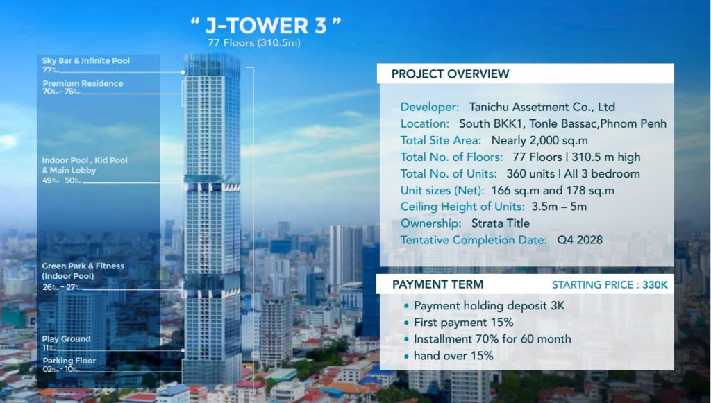 Looking for a luxurious and prestigious address in Phnom Penh? Look no further than J-Tower 3, a new development brought to you by Tanichu Assetment a trusted Japanese developer with a reputation for delivering high-quality residential properties. J-Tower 3 is set to become one of the tallest towers in the city at 77-storeys and with 360 premium condos for sale.
