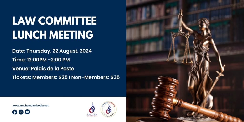 The American Chamber of Commerce in Cambodia (AmCham), in partnership with CamEd Business School, is hosting a Law Committee Luncheon on Thursday, 22 August 2024, from 12:00 PM to 2:00 PM at the Palais de la Poste in Phnom Penh. The luncheon will emphasize member engagement and corporate social responsibility (CSR) within the legal profession.