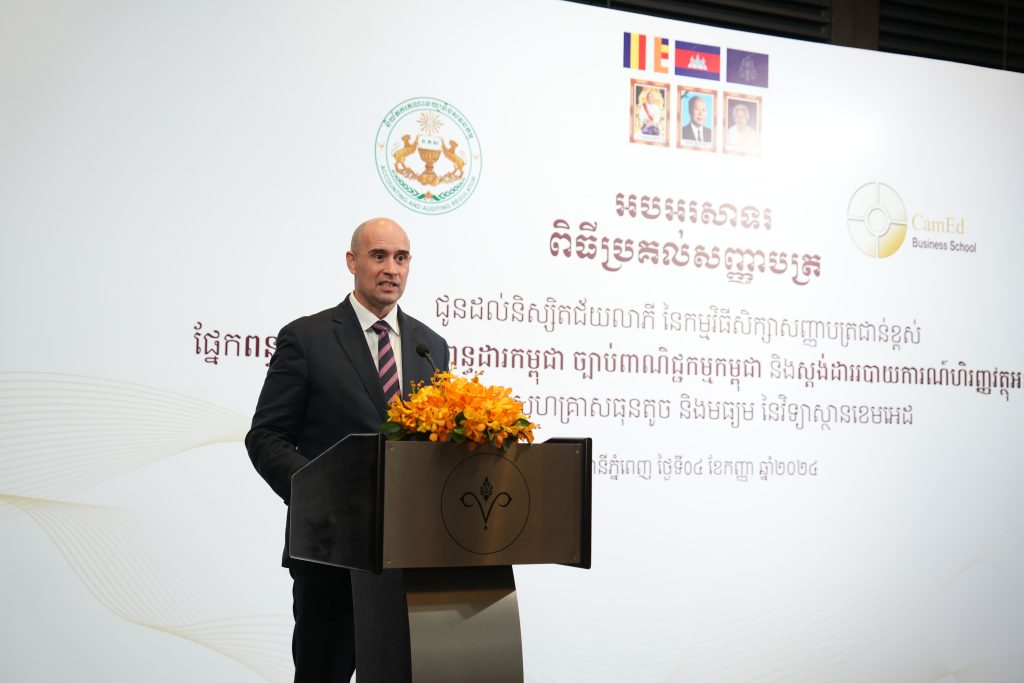 ជាកិច្ចចាប់ផ្តើម លោក ខេស៊ី បាណេត នាយកវិទ្យាស្ថានខេមអេដ បានចូលរួមអបអរសាទរដល់និស្សិត ជ័យលាភីទាំងអស់ និងសម្តែងនូវសេចក្តីសប្បាយរីករាយ ប្រកបដោយមោទនភាព ចំពោះការខិតខំ ប្រឹងប្រែង រហូតទទួលបានជោគជ័យលើការប្រឡងរបស់និស្សិតជ័យលាភីក្នុងថ្ងៃនេះ និងមានប្រសាសន៍ ថា៖ បន្ទាប់ពីវិបត្តិនៃជំងឺកូវីតដែលរីករាលជាសាកល សេដ្ឋកិច្ចប្រទេសកម្ពុជាមិនសូវ ជាមានការកើន ឡើងខ្ពស់ប៉ុន្មានទេ តែទោះជាយ៉ាងណាក៏ដោយសេដ្ឋកិច្ចប្រទេសយើង បានកើនឡើង ចំនួន៥.៦ភាគរយ ក្នុងឆ្នាំ២០២៤នេះ។ ក្នុងនោះផងដែរ តម្រូវការលើផ្នែកសេវាកម្ម រួមមានសេវាកម្មផ្នែកគណនេយ្យ សវនកម្ម និងពន្ធដារមានការកើនឡើងខ្លាំងគួរឲ្យកត់សម្គាល់ ក្នុងរយៈពេល២ឆ្នាំ ចុងក្រោយនេះ។ បន្ថែមពីនេះ លោកខេស៊ីបានសង្កេតឃើញពីការកើនឡើង នៃអនុលោមភាព និងតម្លាភាពនៃការអនុវត្ត ច្បាប់ស្តីពីគណនេយ្យ និងសវនកម្មពីសំណាក់ក្រុមហ៊ុននានា ក្រោមការដឹកនាំ របស់ឯកឧត្តម ប៊ូ ថារិន អគ្គនាយកនិយ័តករគណនេយ្យ និងសវនកម្ម។ ការកើនឡើងនៃអនុលោមភាព និងតម្លាភាពនៃការ អនុវត្តច្បាប់ស្តីពីគណនេយ្យ និងសវនកម្មនេះ បានផ្តល់ផលវិជ្ជមានដល់ការរីក លូតលាស់នៃសេដ្ឋកិច្ច ប្រទេសកម្ពុជា ដែលអាចឲ្យរដ្ឋាភិបាលមានលទ្ធភាពប្រមូលពន្ធបានច្រើន ដើម្បីប្រើប្រាស់ក្នុងការអភិវឌ្ឍ ហេដ្ឋារចនាសម្ព័ន្ធ និងការអប់រំ ដែលផ្តល់ការជម្រុញបន្ថែមលើការអភិវឌ្ឍសេដ្ឋកិច្ចប្រទេសកម្ពុជានា ពេលបច្ចុប្បន្ន និងអនាគត។ លោកខេស៊ីក៏បានបញ្ជាក់ផង ដែរថាសញ្ញាបត្រជំនាញពន្ធដារកម្ពុជា និងសញ្ញាបត្រជំនាញពាណិជ្ជកម្មកម្ពុជាត្រូវបានទទួលស្គាល់ ដោយសមាគមគណនេយ្យករជំនាញ អន្តរជាតិ អេ ស៊ី ស៊ី អេ នៅចក្រភពអង់គ្លេស ជាពិសេសនិស្សិតជ័យលាភី លើសញ្ញាបត្រជំនាញទាំងពីរ នេះនៅវិទ្យាស្ថានខេមអេដ នឹងទទួលបានកាត់មុខវិជ្ជាជំនាញពន្ធដារ និងច្បាប់ពាណិជ្ជកម្មនៃចក្រភព អង់គ្លេស ពីសមាគមផងដែរ។ មិនត្រឹមតែកម្មវិធីជំនាញទាំងពីរនេះ វិទ្យស្ថានខេមអេដទាំងមូល ក៏ទទួលបានការទទួលស្គាល់គុណភាពអប់រំ ពីសំណាក់ស្ថាប័នវាយតម្លៃគុណភាពអប់រំរបស់សហរដ្ឋ អាមេរិក ACBSP និងបណ្តាញសាកលវិទ្យាល័យអាស៊ាន AUN-QA ផងដែរ។ ការទទួលស្គាល់ទាំងអស់ នេះ បានកើតចេញពីការខិតខំប្រឹងប្រែងក្នុងការពង្រឹងគុណភាពអប់រំ ក៏ដូចជាពង្រឹងលើកម្មវិធីសេវាកម្ម និស្សិតនានា។ លោកខេស៊ី ក៏បានបង្ហាញផងដែរថា នៅក្នុងឆ្នាំនេះ វិទ្យាស្ថានខេមអេដក៏បានចុះ អនុសារណៈយោគយល់គ្នាលើកម្មវិធីជំនាញពន្ធដារ ជាមួយសាលាជាតិពន្ធដារ ដែលជាហេតុធ្វើឲ្យ និស្សិតដែលបញ្ចប់ការសិក្សាដោយជោគជ័យលើកម្មវិធីជំនាញពន្ធដារ នៅវិទ្យាស្ថានខេមអេដទទួល បានការកាត់ក្រេឌីត ចំនួន៦ ក្នុងដំណើរការសិក្សាយកអាជ្ញាបណ្ណពន្ធដារ ពីស