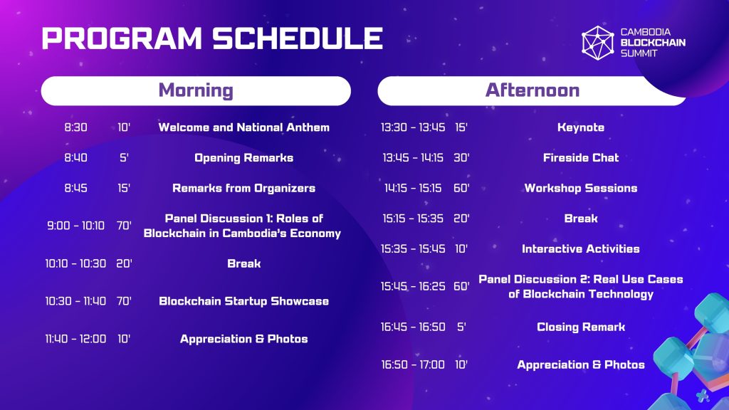 For more details and ticket registration, visit blockchaincambodia.net or contact cambodiablockchainsummit@gmail.com.