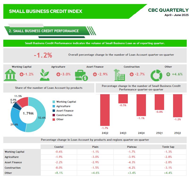 The proportion of loans overdue by more than 90 days increased to 7.4% of all small business lending, with working capital loans showing the highest risk at 11.2%. Regional trends were uneven: delinquency ratios in the Plateau surged more than 21% from the previous quarter, while the Tonle Sap and Coastal Plain regions also saw double-digit increases.