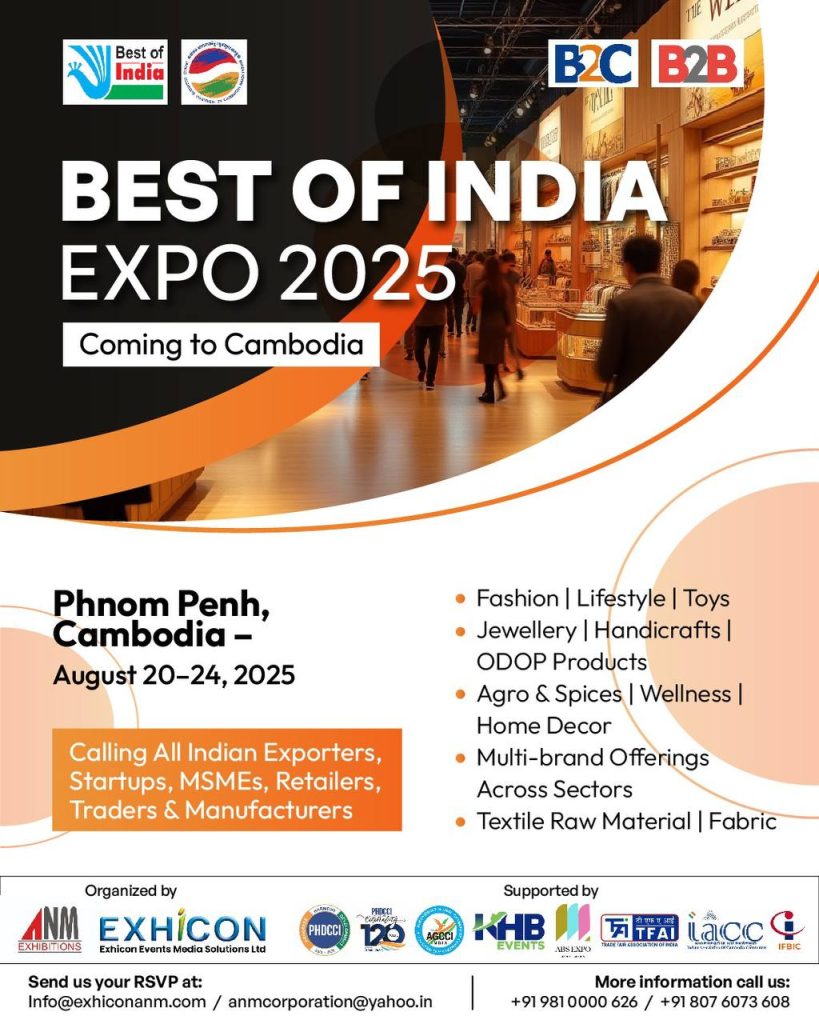 Organized by ANM Exhibitions Pvt. Ltd. and EXHICON Events Media Solutions Ltd., the expo aims to give Cambodian businesses and consumers direct access to Indian products spanning multiple sectors. Exhibitors will present goods ranging from agro products, tea, and spices to jewelry, handicrafts, textiles, home furnishings, garments, and wellness items.