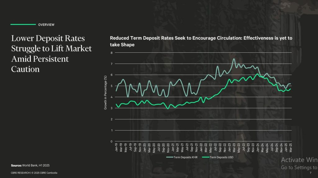 CBRE’s research noted that market liquidity in Siem Reap is being squeezed as deposit growth at Cambodian banks outpaces new property investments. Many buyers remain cautious, preferring to keep funds in savings rather than commit to long-term real estate projects.