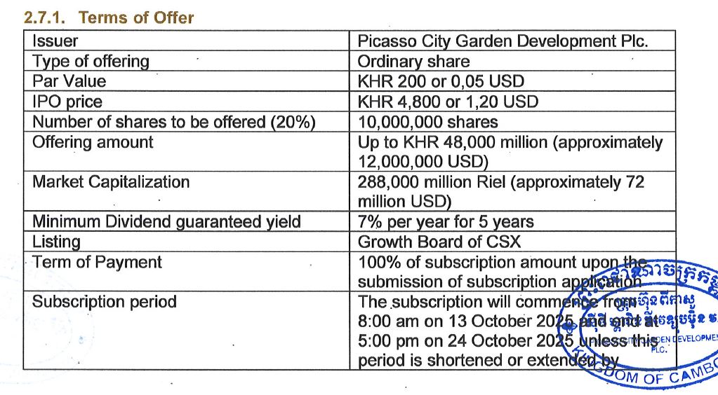 Picasso City Garden Development Plc, has officially launched its initial public offering (IPO) on the Cambodia Securities Exchange (CSX) Growth Board, seeking to raise USD 12 million through the sale of 10 million shares at USD 1.20 per share.