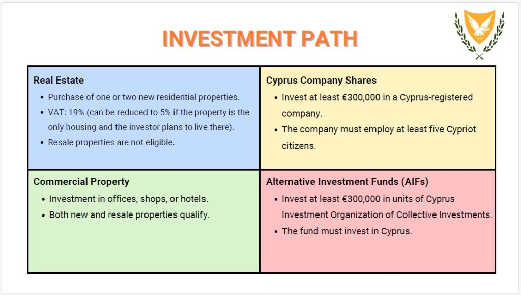 To qualify, applicants must invest €300,000 plus VAT in real estate, a Cyprus-registered company, or an investment fund. They must also show a minimum annual income of €50,000 and maintain health insurance coverage. The program allows inclusion of spouses, children, and parents, with an application process that typically takes four to six months.