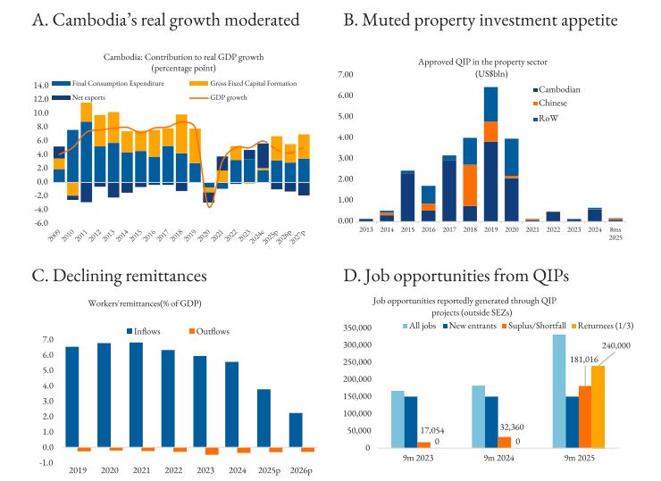 According to the World Bank, Cambodia continues to face a mix of domestic and external headwinds that are reshaping growth prospects. The report notes that the property market downturn is dampening investment and slowing construction, while border tensions are affecting labor markets, tourism, and the broader flow of goods and people.