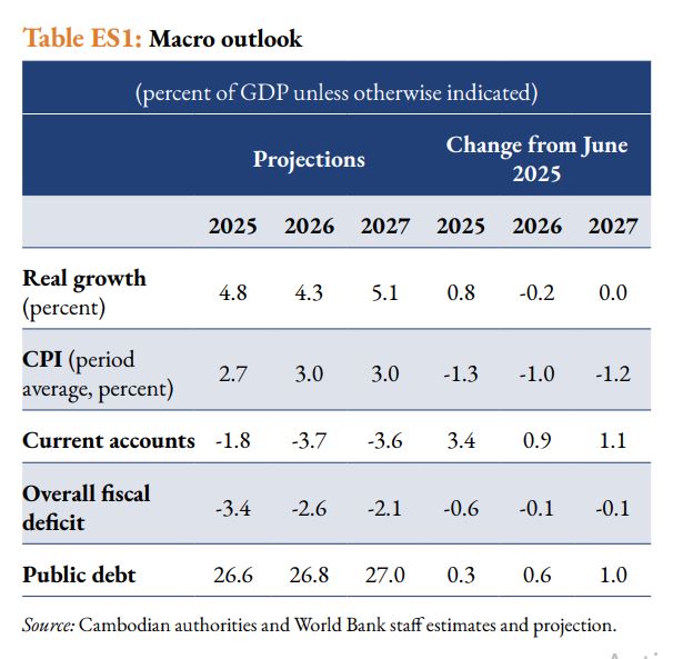 The report highlights that Cambodia enters this period with relatively strong macroeconomic buffers. International reserves remain adequate at the equivalent of 7.5 months of imports, inflation is contained at an average of 2.7 percent, and public debt stands at around 26 percent of GDP.